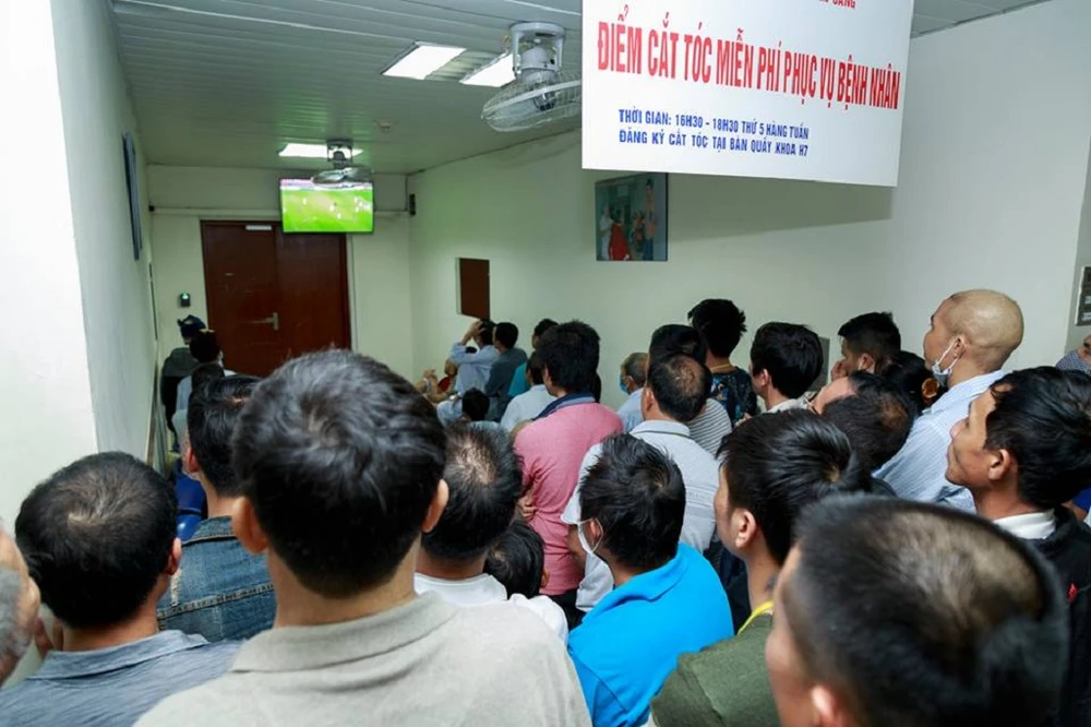 Y bác sĩ và bệnh nhân xem bóng đá tại BV Đại học Y Dược TP.HCM. ẢNH: BVCC