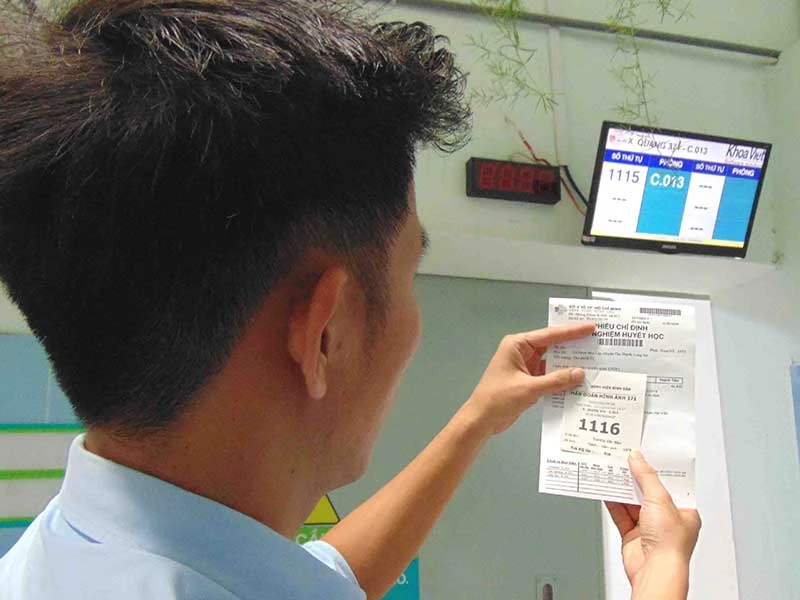 Đưa ông Thành phiếu chỉ định xét nghiệm huyết học, BS Phạm Văn Viễn (Khoa khám bệnh) chỉ vào những dòng chữ dưới góc trái rồi giải thích: “Hiện có 10 người chờ chụp X-quang, thời gian đợi khoảng 30 phút; 15 người chờ xét nghiệm, thời gian đợi khoảng 1 tiếng; 30 người chờ siêu âm, thời gian đợi gần 1 tiếng rưỡi. Anh nên chụp X-quang trước, kế đến xét nghiệm rồi siêu âm để bớt thời gian đứng đợi”.