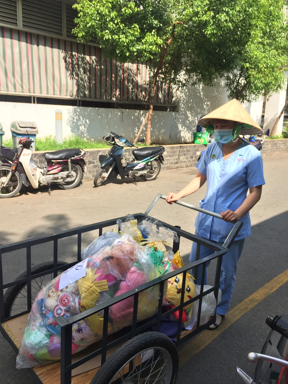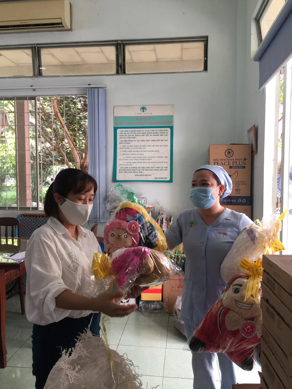 Nhân viên bệnh viện vận chuyển các món quà để đi trao cho các bé. Ảnh: CT