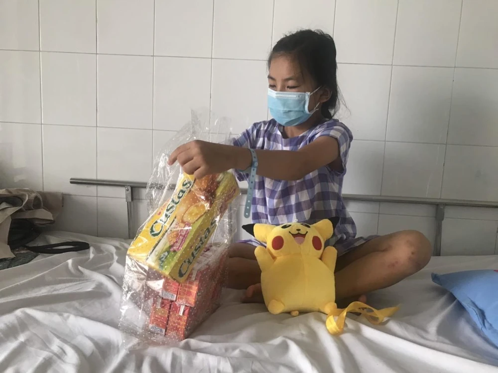 Một bệnh nhân nhí đang điều trị bệnh vui sướng với món quà. Ảnh: CT
