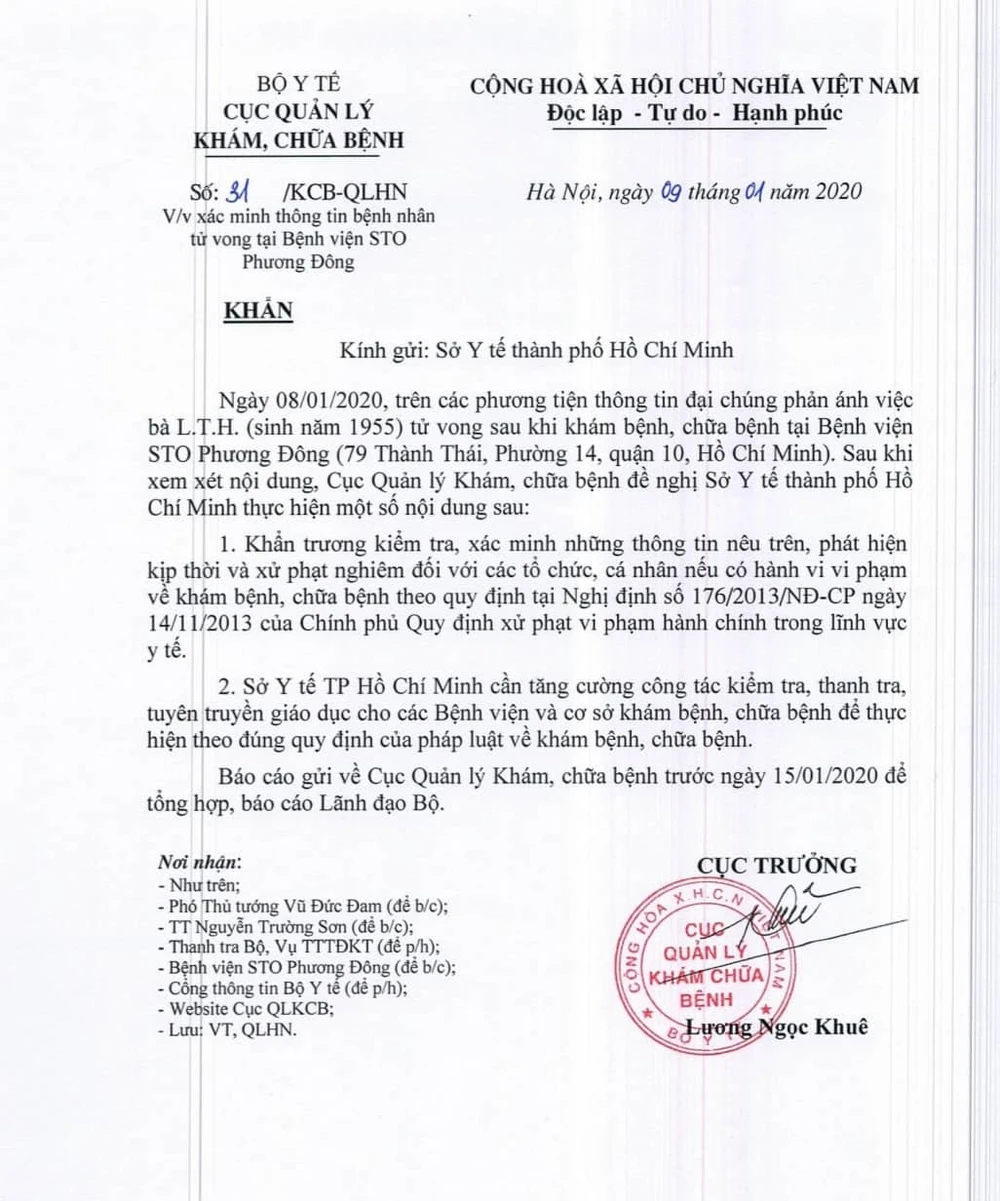 Chiều 10-1, Cục Quản lý khám chữa bệnh, Bộ Y tế gửi công văn yêu cầu Sở Y tế TP.HCM khẩn trương kiểm tra, xác minh thông tin liên quan đến trường hợp bà LTH tử vong bất thường tại BV STO Phương Đông những ngày qua.