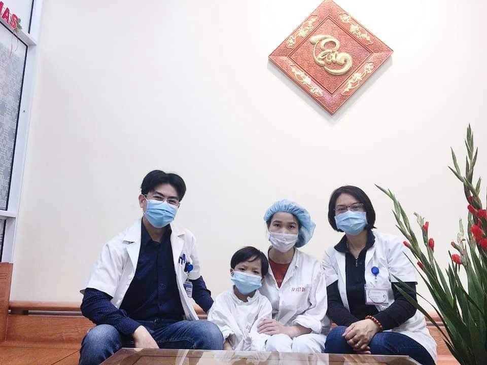 H. và mẹ cùng các bác sĩ trong ngày ra viện. Ảnh: BVCC