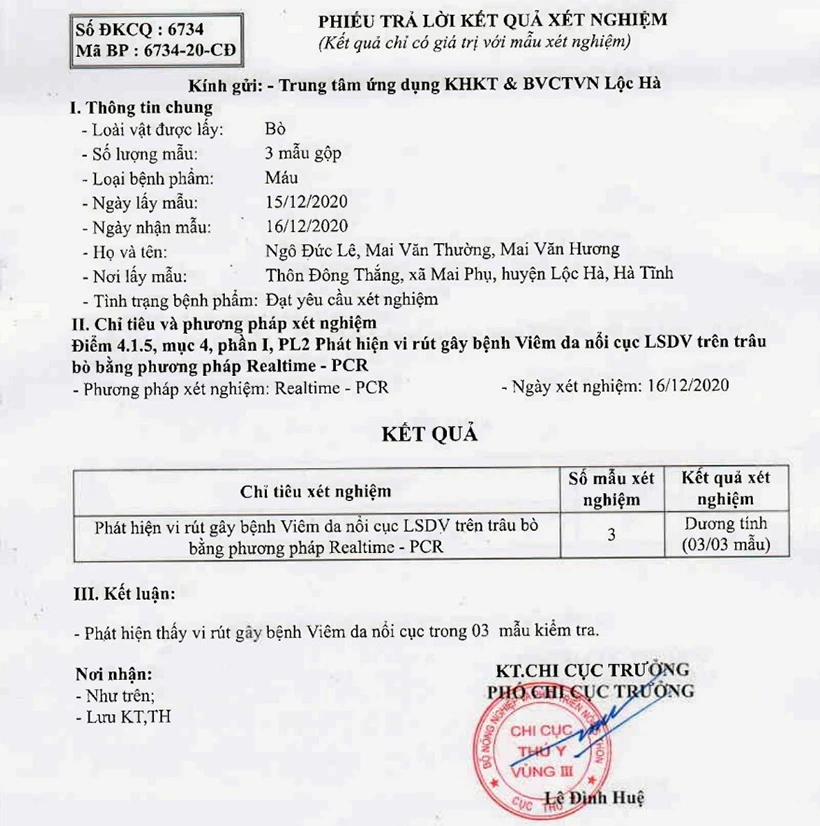 Theo Cục Thú Y vùng III (thuộc Cục Thú Y, đóng tại TP Vinh, Nghệ An), qua xét nghiệm bằng phương pháp Realtime-PCR các mẫu bệnh phẩm ở Hà Tĩnh gửi ra cho kết quả dương tính với virus viêm da nổi cục LSDV trên trâu bò.