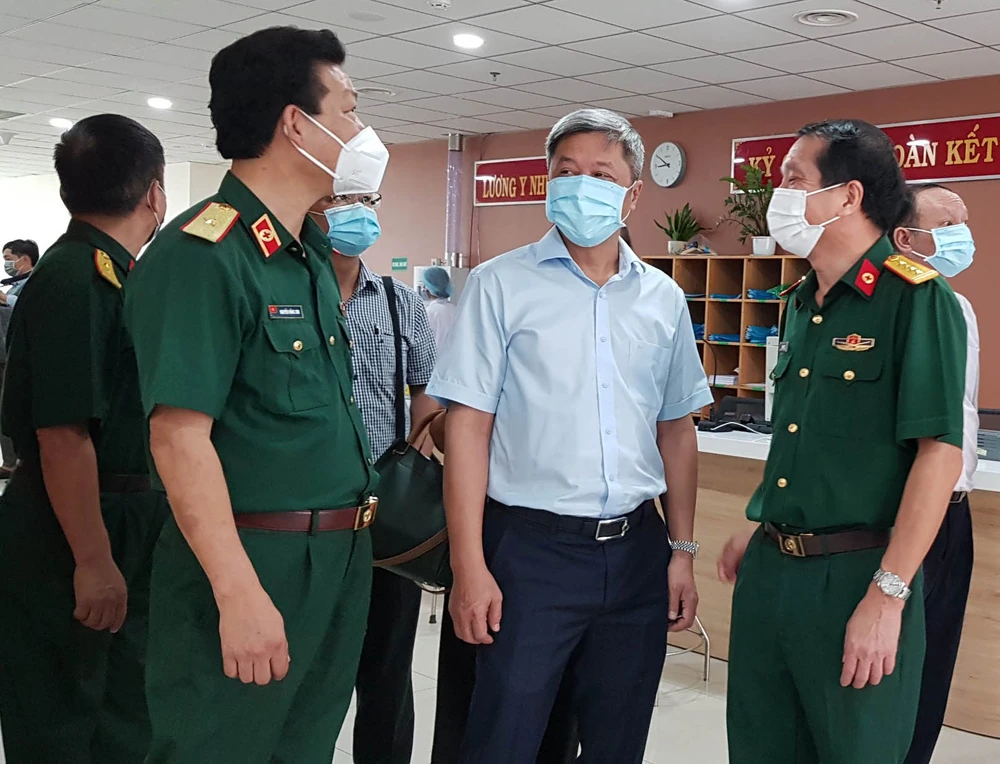 Thứ trưởng Bộ Y tế Nguyễn Trường Sơn (áo trắng) trao đổi hoạt động phòng, chống dịch COVID-19 với BV Quân y 175. Ảnh: VÂN SƠN