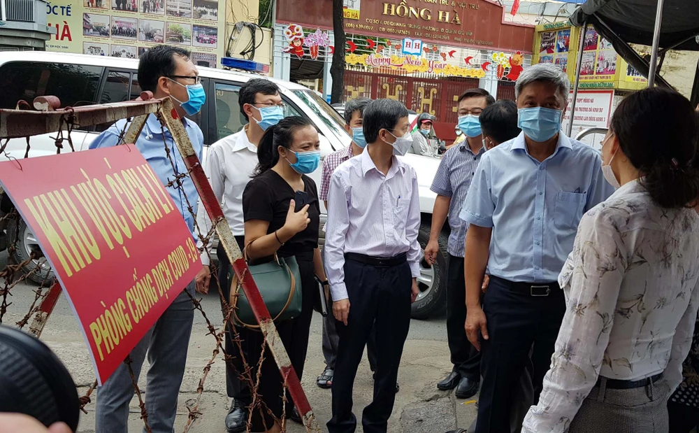 Thứ trưởng Bộ Y tế Nguyễn Trường Sơn (thứ 2 từ phải qua) động viên lực lượng phòng chống dịch tại điểm phong tỏa ở Gò Vấp. Ảnh: VÂN SƠN