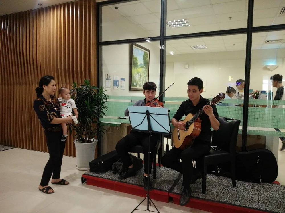 Anh Đoàn Trọng Hồ Nguyên (20 tuổi) và Lê Trung Kiên (27 tuổi), sinh viên Nhạc viện TP.HCM đang chơi nhạc tại bệnh viện.