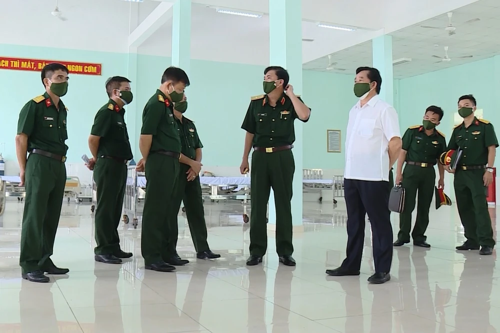 Ông Nguyễn Hoàng Thao- Phó Bí thư Tỉnh ủy Bình Dương cùng lãnh đạo lực lượng quân đội kiểm tra bệnh viện dã chiến truyền nhiễm số 5B. Ảnh: KD
