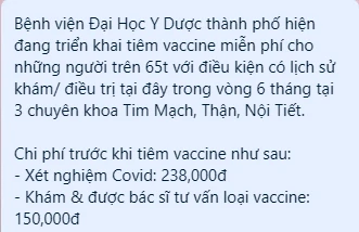 Cụ thể thông tin lan truyền trên mạng xã hội gần đây: Bệnh viện ĐH Y dược TP.HCM tiêm vaccine miễn phí cho những người trên 65 tuổi với điều kiện có lịch sử khám hoặc điều trị tại BV trong vòng 6 tháng tại 3 chuyên khoa Tim mạch, Thận và Nội tiết. Cạnh đó, BV sẽ thực hiện xét nghiệm và khám, tư vấn loại vaccine sử dụng trước khi tiêm với tổng chi phí là 388.000 đồng.