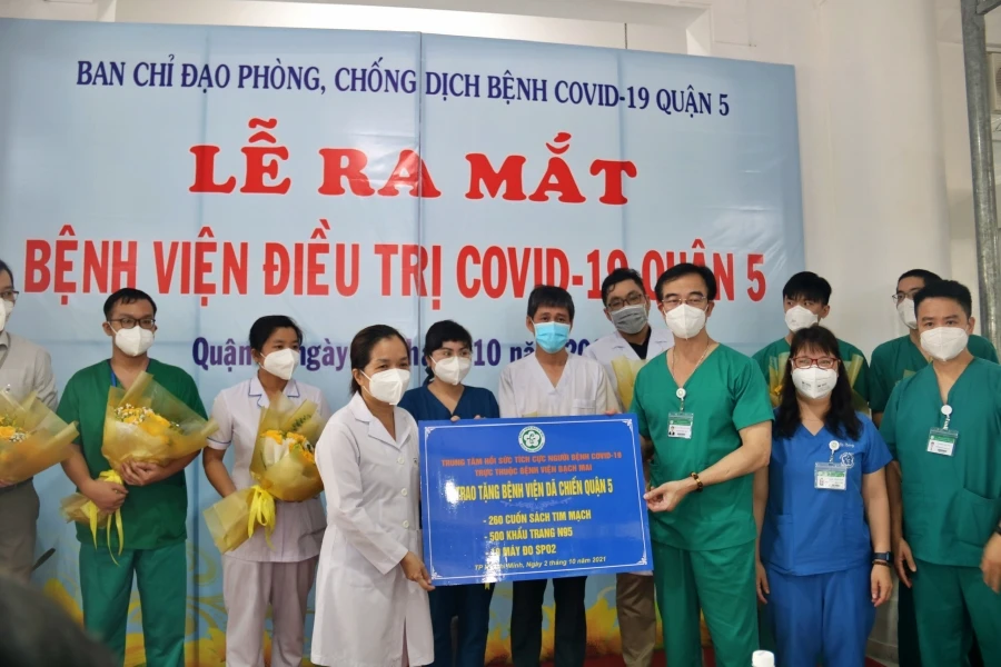 Dịp này, Trung tâm Hồi sức tích cực người bệnh COVID– 19 trực thuộc bệnh viện Bạch Mai đã trao tặng bệnh viện điều trị bệnh nhân COVID-19 quận 5 một số thiết bị y tế: 260 cuốn sách tim mạch, 500 khẩu trang N95, 10 máy đo SPO2.