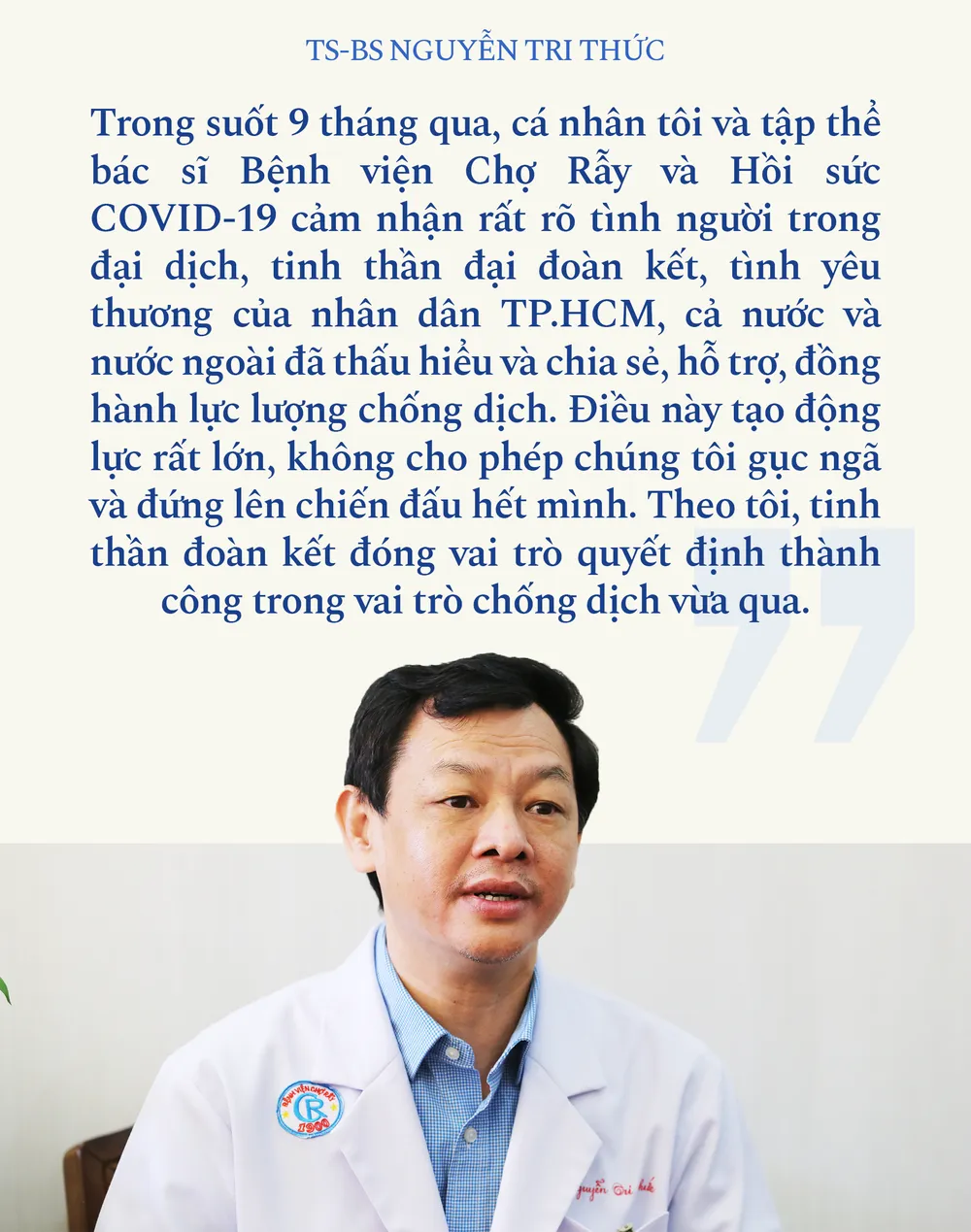 + Tôi được Bộ Y tế giao lãnh đạo BV Chợ Rẫy. Khi dịch COVID-19 ở đỉnh điểm, BV Chợ Rẫy tiếp nhận hàng trăm bệnh nhân, các tỉnh cũng chuyển về đây. Cùng lúc, BV Chợ Rẫy vừa điều trị bệnh lý thông thường cho khu vực phía Nam, vừa điều trị COVID-19.
