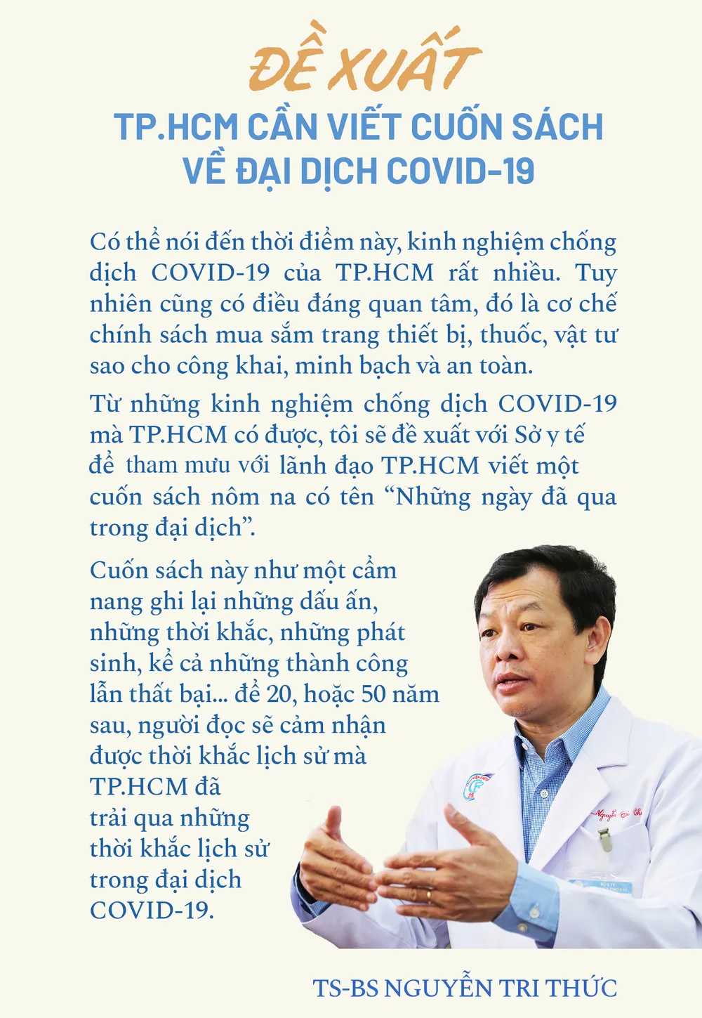 Thực tình tôi không sợ khổ, cũng chẳng sợ khó. Tôi muốn có sự chuẩn bị kỹ càng để khi nhận nhiệm vụ của một giám đốc BV Hồi sức COVID-19 thì phải thành công. Tôi xin vị lãnh đạo TP.HCM cho suy nghĩ 15 phút trước khi đưa ra câu trả lời.