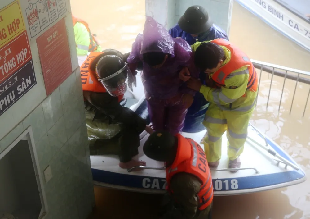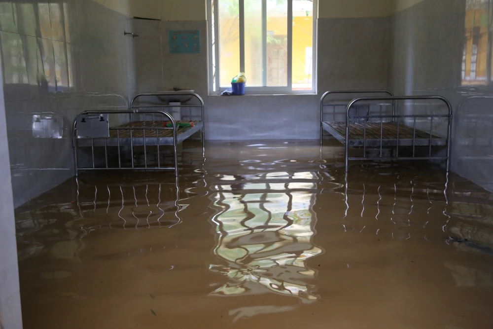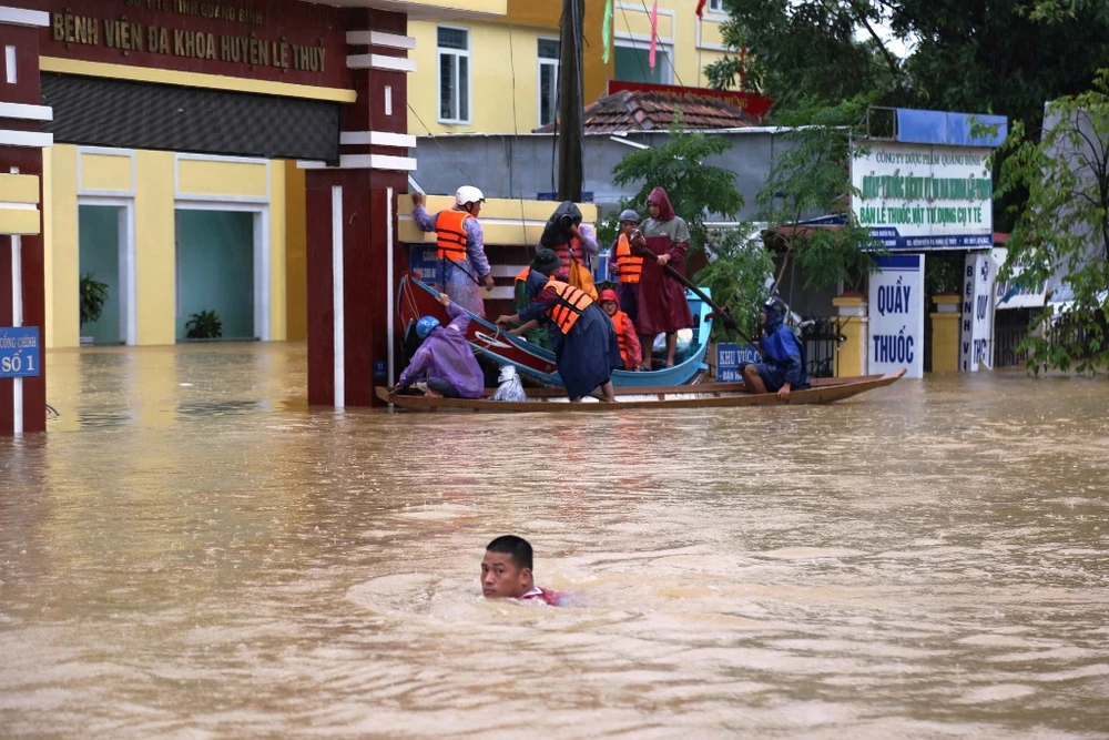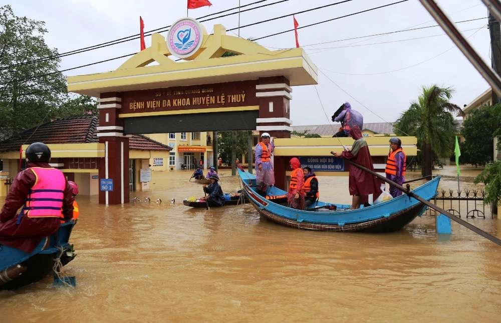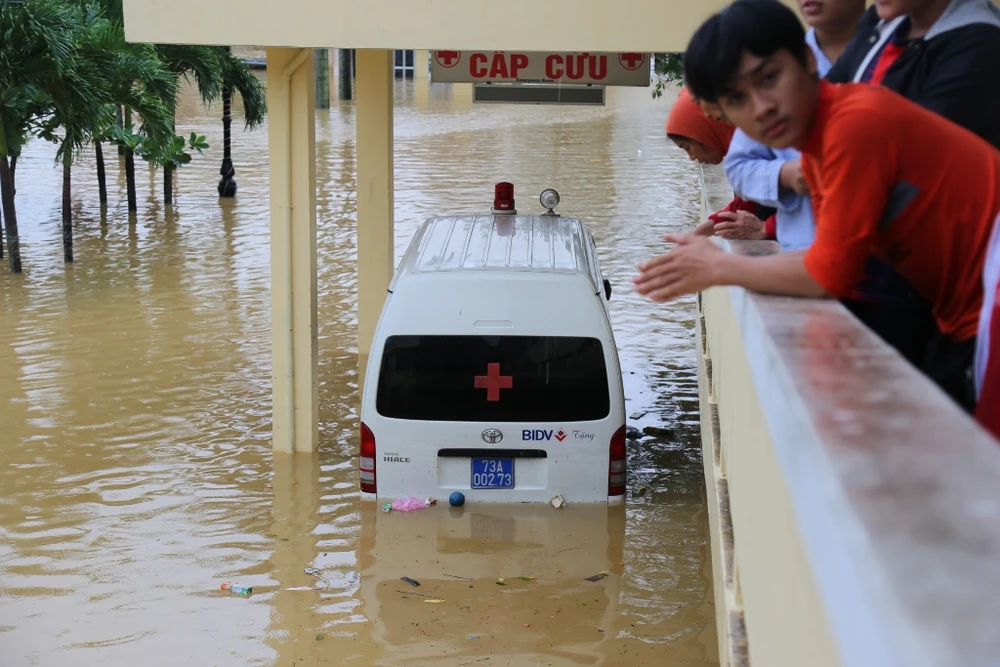 Đến sáng 20-10, BV Đa khoa huyện Lệ Thủy (Quảng Bình) vẫn ngập sâu trong nước. Hơn 300 người trong đó có đội ngũ y bác sĩ, bệnh nhân và người thân phải sống trong khốn khó. Ảnh: HẢI HIẾU