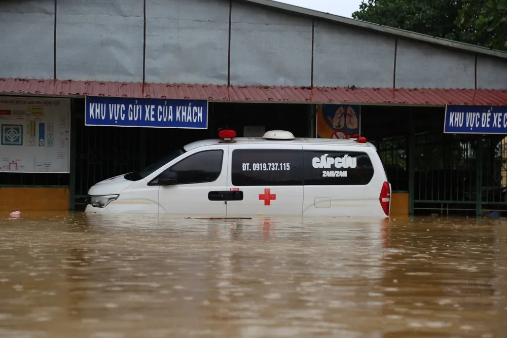 Tất cả mọi người trong BV đều ở các tầng trên do tầng trệt bị ngập chìm trong nước. Ảnh: HẢI HIẾU