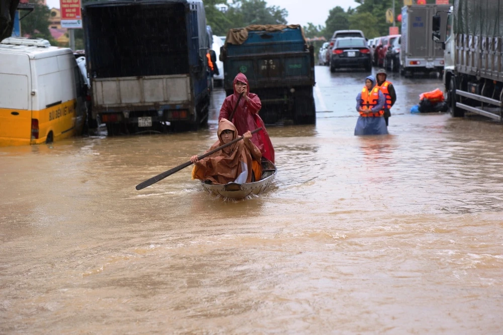 Chiều 20-10, thai phụ Hoàng Thị Ái (ngụ xã Phong Thủy, huyện Lệ Thủy, Quảng Bình) chuyển dạ sinh con, phải chuyển bằng thuyền đến BV. Chồng chị Ái bị bệnh nên phải gọi cảnh sát đến hỗ trợ đưa chị đi sinh. Ảnh: HẢI HIẾU