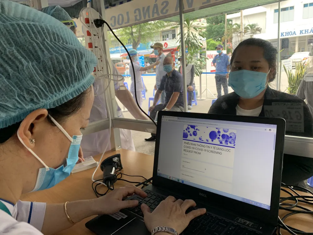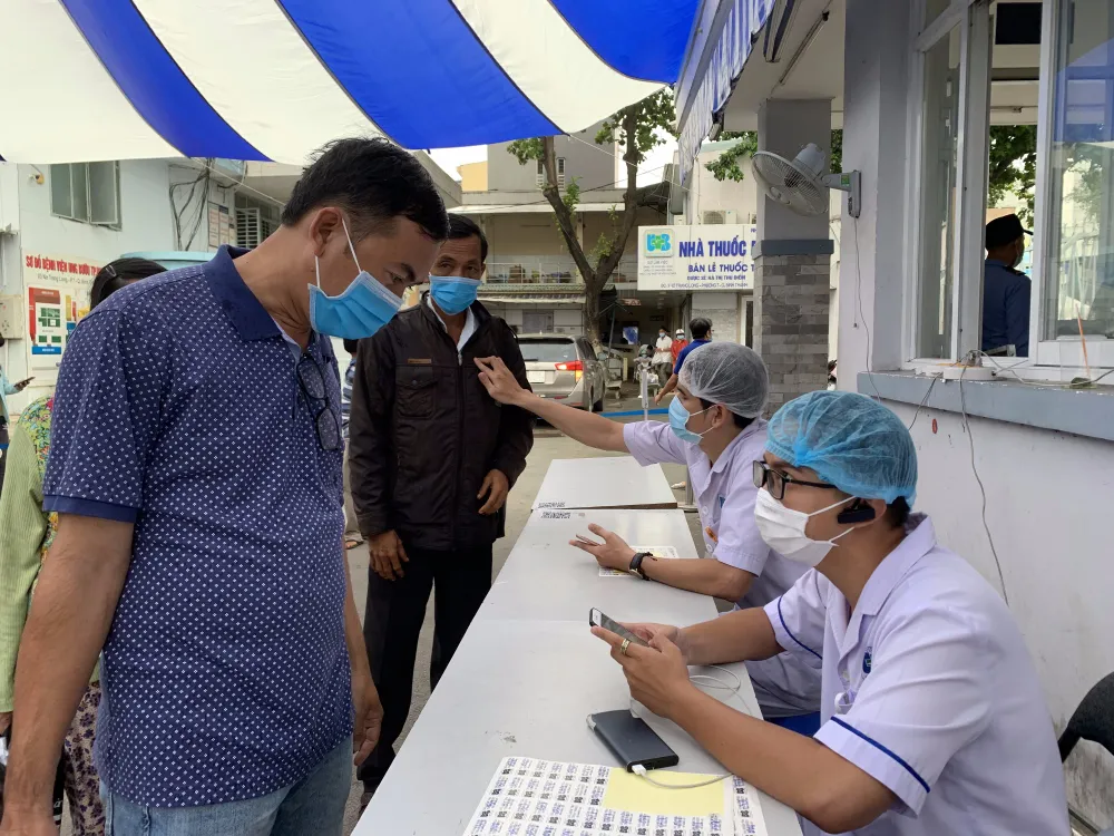 Bệnh viện cử nhân viên y tế khai báo y tế giúp người dân ở gần cổng ra vào bệnh viện sau khi được đo thân nhiệt.