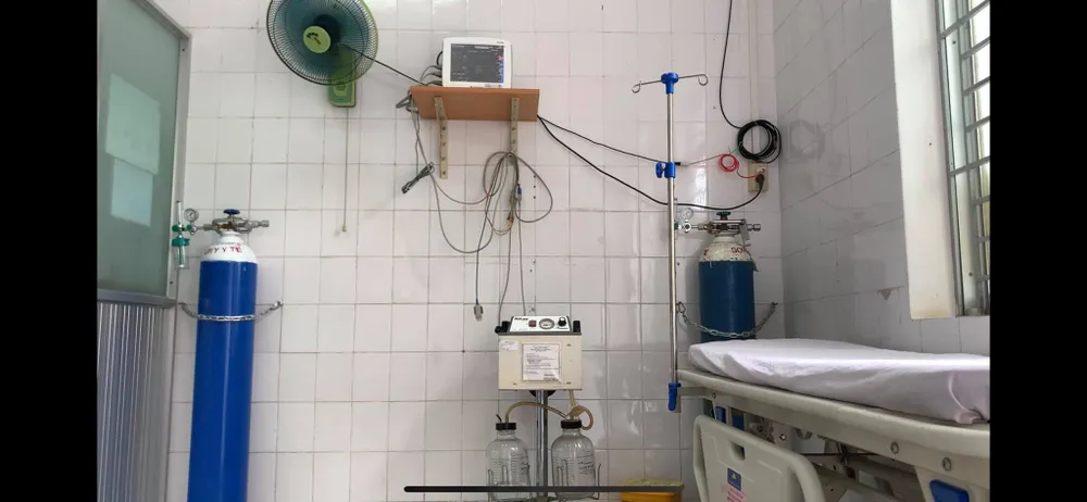 Buồng cấp cứu sàng lọc COVID-19 cũng trang bị sẵn sàng máy đo sinh hiệu, bình thở oxy để cấp cứu cho bệnh nhân.