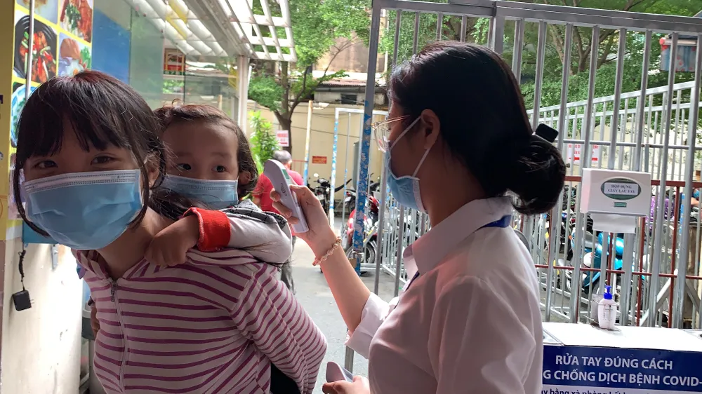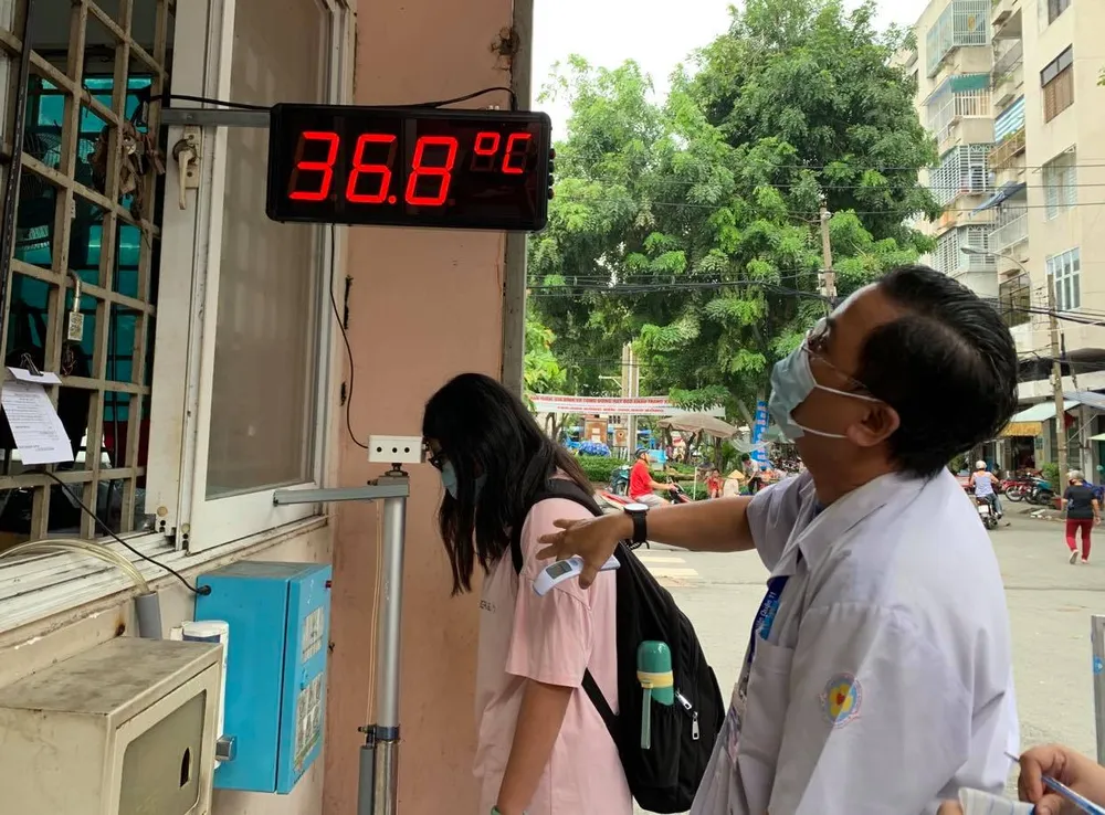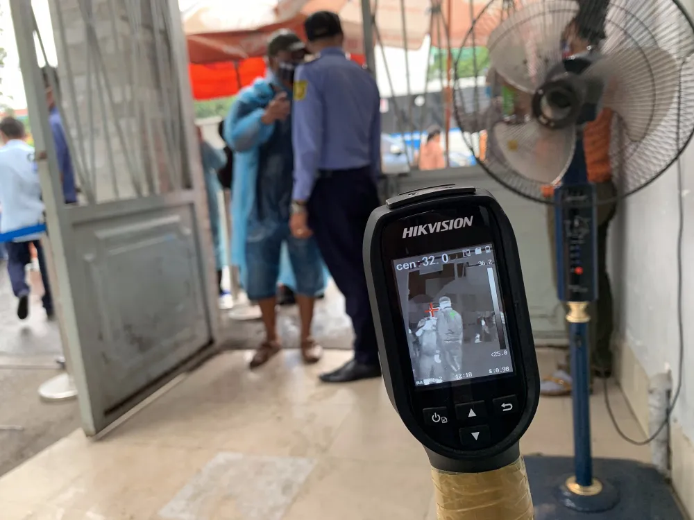 Máy đo thân nhiệt tự động do Bệnh viện Quận 11 lắp đặt ở cổng chính.