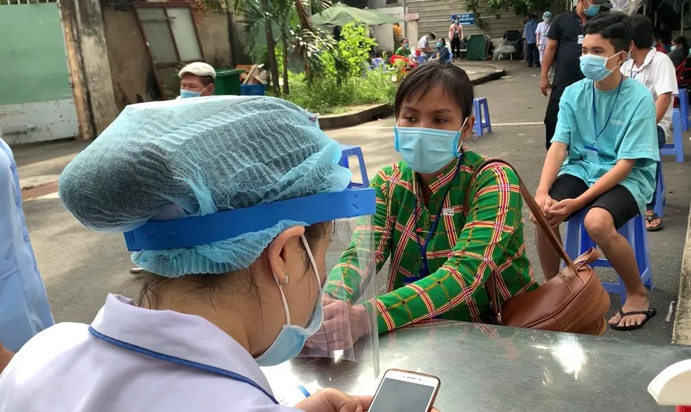 Người ra vào tại mỗi mỗi cổng của Bệnh viện Quận 11 đều được nhân viên y tế đo thân nhiệt và cho khai báo y tế.