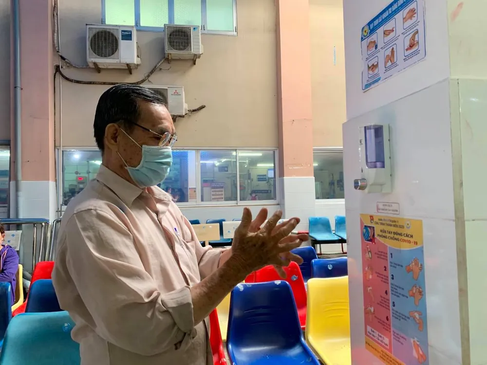 Bệnh viện dán nhiều hướng dẫn và hệ thống dung dịch rửa tay tự động để người dân lưu ý thực hiện phòng ngừa COVID-19.