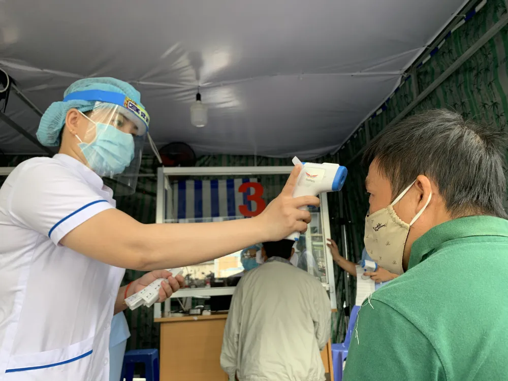 Người bệnh khi đến Bệnh viện Bệnh Nhiệt đới đều được đo thân nhiệt cẩn thận.