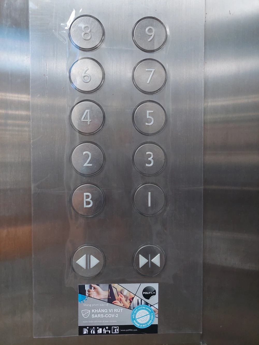 Màng phim chống virus được dán ở nút bấm gọi thang máy ở Bệnh viện Quân Y 175. Ảnh: CL