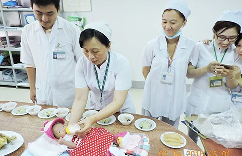 Ngày 1-4 vừa qua, các hộ lý, điều dưỡng bệnh viện làm đầy tháng cho bé gái bị bỏ rơi. Ảnh: T.Q.CƯỜNG