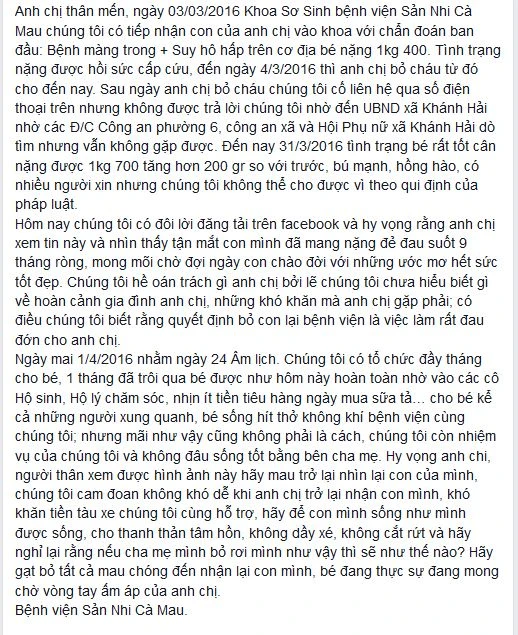 Bác sĩ Trần Quốc Cường - Trưởng phòng hành chính quản trị của BV Sản Nhi Cà Mau cũng đã chia sẻ thông tin trên trang cá nhân của mình với mong muốn ba mẹ của bé đến nhận lại con của mình.