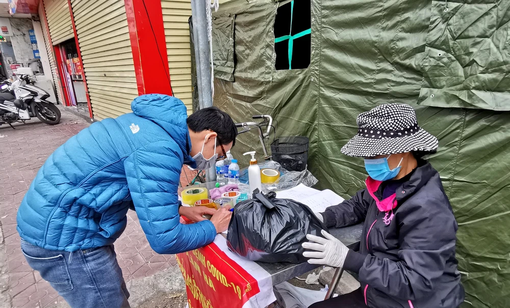 Thành viên tổ kiểm soát dịch bệnh khu phố giúp người dân chằng buộc đồ dùng gửi cho bệnh nhân