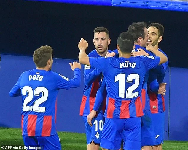 Các cầu thủ chủ nhà Eibar ăn mừng bàn thắng sau siêu phẩm của tiền đạo Kike. Ảnh: Getty Images.