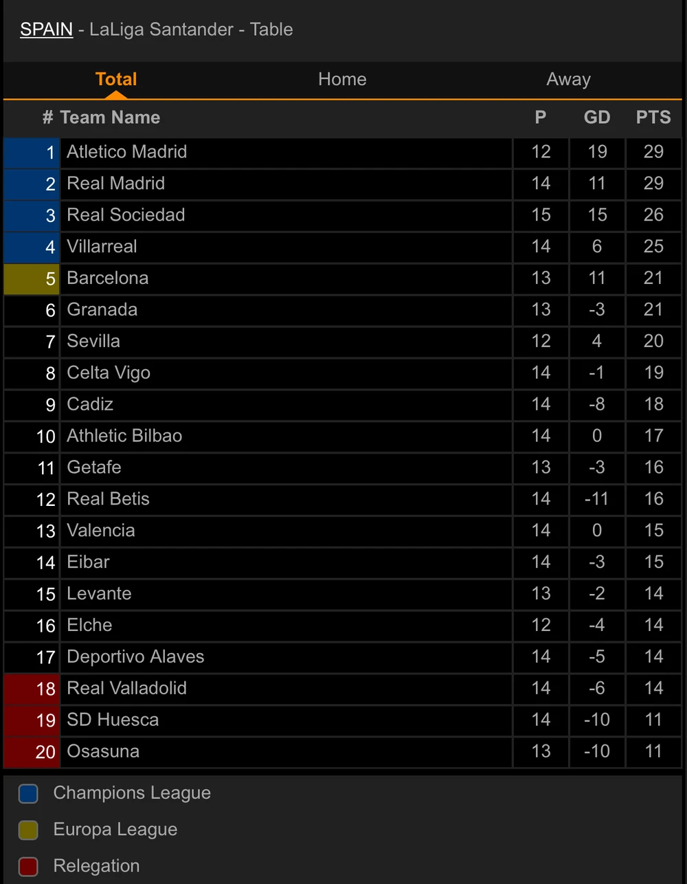Mặc dù cùng điểm số, nhưng Real vẫn xếp sau Atletico Madrid bởi đội bóng của HLV Zidane thua đối thủ hiệu số bàn thắng, bên cạnh đó Real Madrid cũng thi đấu nhiều hơn Atletico Madrid 2 trận.