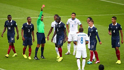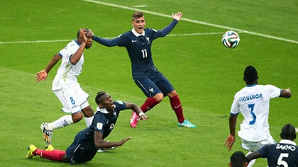 Những tưởng hiệp 1 kết thúc mà không có bàn thắng thì đúng phút cuối cùng, tuyển Pháp được hưởng quả đá 11 mét sau tình huống đẩy người phía sau rất non của Wilson Palacios với Paul Pogba trong vòng cấm. Honduras phải nhận quả 11 mét và còn bị mất người khi Palacios phải nhận thẻ vàng thứ 2 sau tình huống phạm lỗi này.