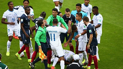 Trọng tài thường xuyên phải cắt còi trước lối chơi rắn và tiểu xảo của các cầu thủ Honduras. Ảnh: Getty Images.