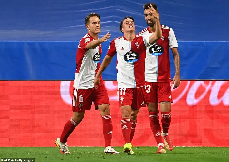 Bàn thắng của Franco Cervi (giữa) giúp Celta Vigo khép lại hiệp một với lợi thế dẫn trước 2-1. Ảnh: Getty Images.