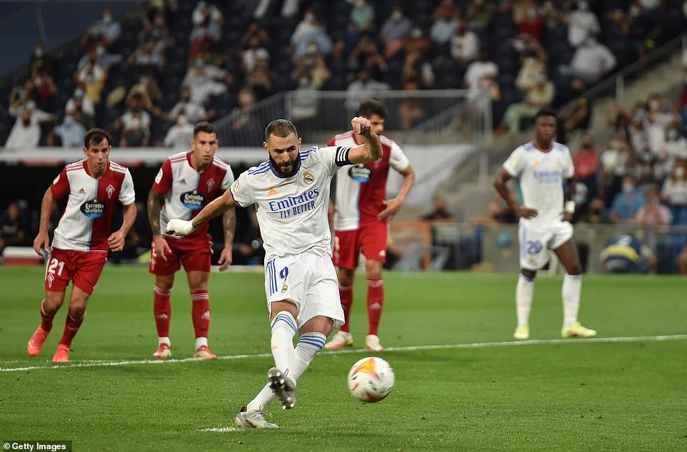 Benzema hoàn tất hattrick trên chấm phạt đền. Ảnh: Getty Images.