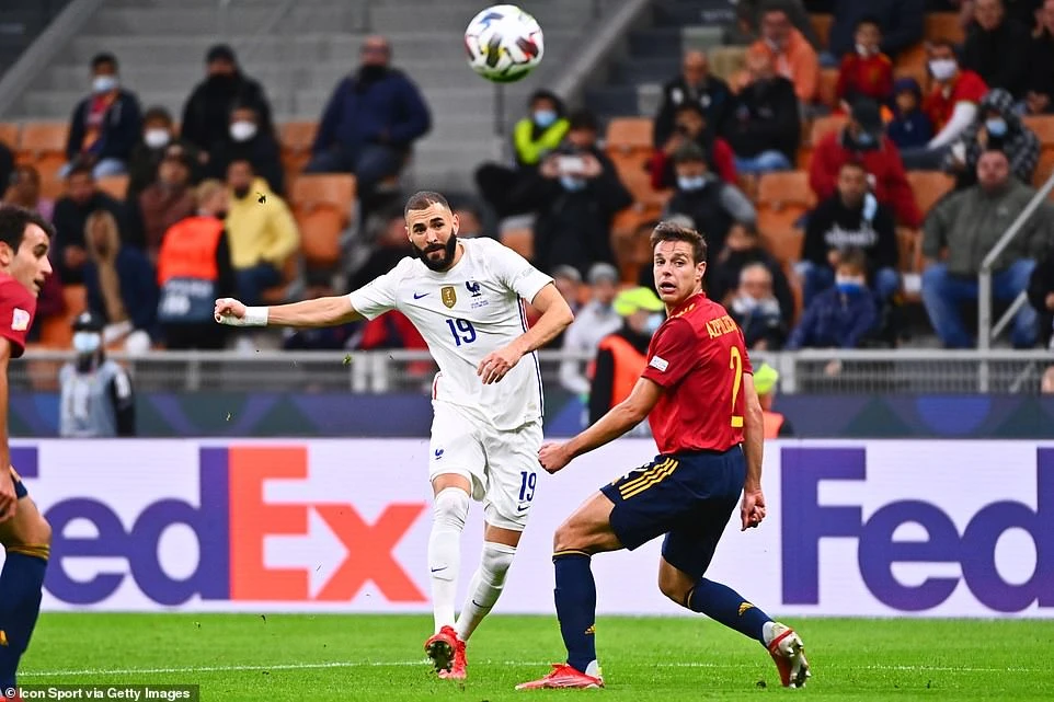 Lợi thế dẫn bàn của Tây Ban Nha không được duy trì lâu, bởi chỉ 2 phút sau tiền đạo Benzema đã “nổ súng” để đưa trận đấu về vạch xuất phát. Nhận đường chuyền của Mbappe, Benzema đặt lòng trong vòng cấm giúp tuyển Pháp có bàn thắng gỡ hòa 1-1 ở phút 66.