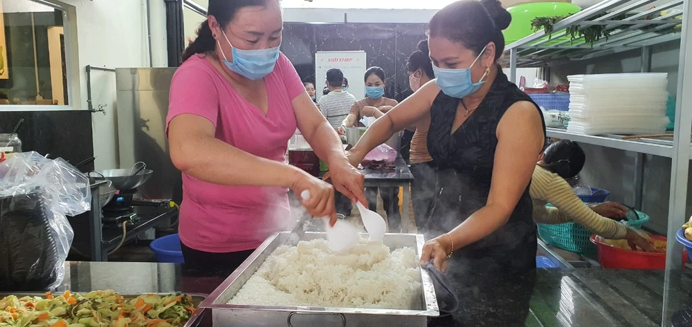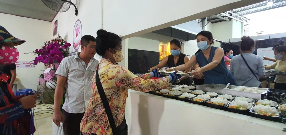 Trong tình hình dịch bệnh COVID-19 diễn biến phức tạp, mỗi người dân đến ăn cơm đều được phát khẩu trang miễn phí, rửa tay và khuyến khích nhận phần cơm mang đi.