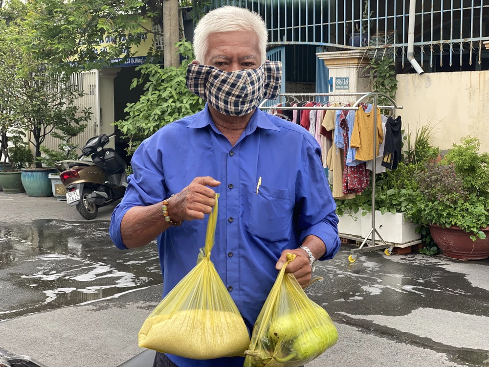 Hôm nay, một người dân trong khu phố tới nhận cơm và còn được nhận thêm gạo và rau củ từ Công ty Long Minh Hân hỗ trợ. Ảnh: ĐẶNG LÊ