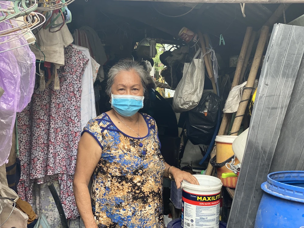 Cư trú tại phường Bình Trưng Đông được 11 năm nhưng bà vẫn chưa đăng ký tạm trú tại đây. Nhặt ve chai chỉ đủ sống qua ngày chứ không có tích lũy. Dịch bệnh ập đến và kéo dài, hàng ngày bà phải dựa vào những suất ăn miễn phí từ “Bếp cơm nghĩa tình”.