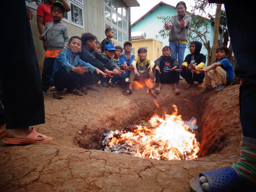 Khi hỏi các thầy cô thì được biết là thầy trò cùng đốt rác phía sau trường để cùng sưởi ấm trong buổi cái lạnh ở vùng cao này. Rác ở đây là những cành, lá khô được các em học sinh quét dọn, gom vào để đốt vừa sưởi ấm, vừa làm sạch đẹp sân trường.