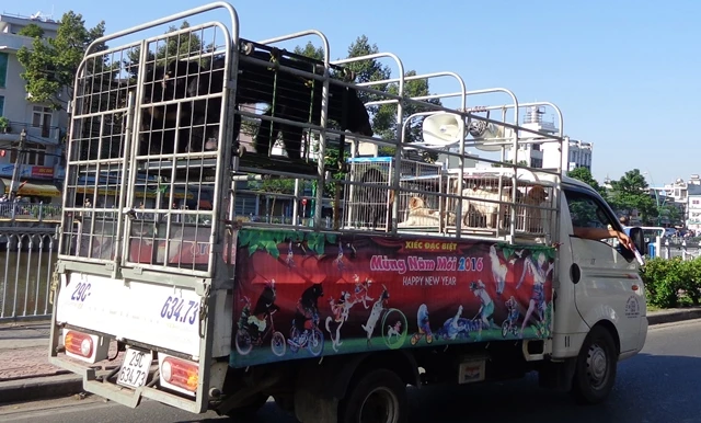 Vừa chạy, vừa phát loa, người ngồi bên ghế phụ vừa xìa các tờ rơi quảng cáo chương trình xiếc thú cho người đi xe máy từ phía sau lướt tới… nhận.