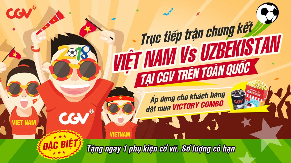 Cụ thể, CGV Việt Nam đã thông báo lần đầu tiên các fan bóng đá có thể hòa cùng không khí sân cỏ không thể sôi động hơn tại hệ thống rạp của đơn vị này. Chương trình áp dụng cho các cụm rạp trên cả nước từ ngày 25-1.