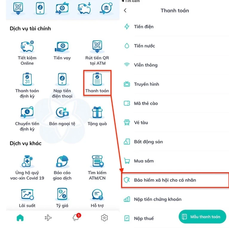 Theo đó, người dân đóng tiếp tiền BHXH tự nguyện, gia hạn thẻ BHYT hộ gia đình trên ứng dụng trực tuyến của 3 ngân hàng này như sau: