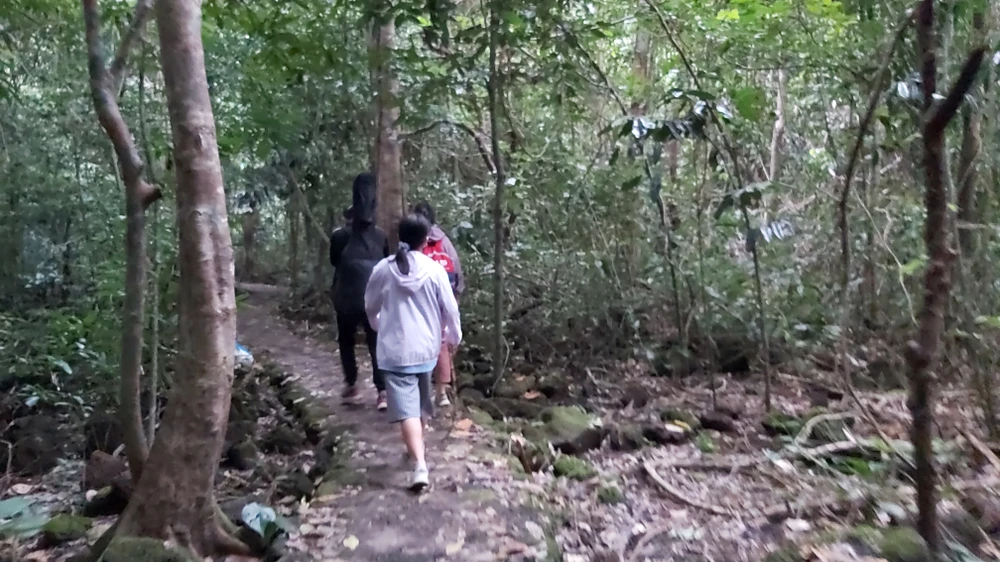 Nhưng bạn yên tâm, cung đường xuyên rừng sẽ không hề nhàm chán. Đường đi gồ ghề đất đá, rễ cây lộ thiên, không cẩn thận rất dễ vấp ngã. Nhưng bạn cứ thong thả bước đi, để còn quan sát thảm thực đa dạng xung quanh mình. Thỉnh thoảng bạn lại nghe vài âm thanh lạ từ cây cối, hay chim muông cũng thú vị lắm. Chưa kể, đang đi, bạn bỗng nghe xào xào, cành lá rung lắc, đích thị mấy anh chàng khỉ đang chạy nhảy quanh đấy.
