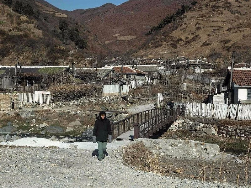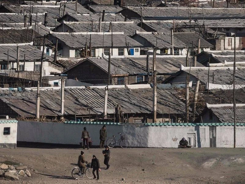Một phụ nữ Triều Tiên đi bộ trước các căn nhà tại một ngôi làng gần TP Kimchaek, cách Kilju khoảng 35 km. Ảnh: AFP