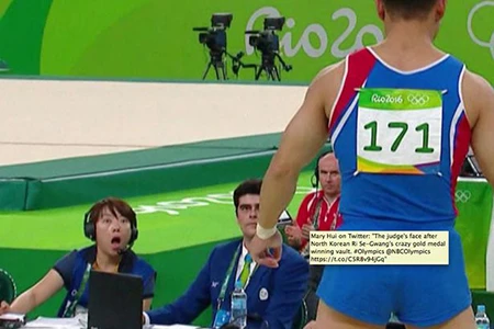VĐV của Triều Tiên giành HCV môn thể dục dụng cụ sau khi đánh bại đối thủ đáng gờm người Nga Denis Ablyazin. Khi Ri Se-Gwang đứng trên bục nhận huy chương, bao quanh bởi rừng ống kính của các phương tiện truyền thông, anh luôn giữ khuôn mặt lạnh lùng với đôi mắt buồn.
