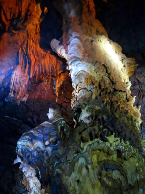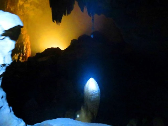 Đi sâu nữa, một đại thạch nhũ khổng lồ đứng độc lập giữa một vực hang rộng lớn. Khối thạch nhũ này đã có tuổi hàng trăm triệu năm. Những đường nhũ vâm váp hiện rõ dưới ánh sáng led, vô số đường vân bện chặt bởi canxi già, hình hài của nó ngày một đẹp lên bởi được bổ sung từ vô số tia nước từ trần hang và không khí ẩm trong đó. Nhìn khối thạch nhũ vĩ đại này, người ta liên tưởng nó y hệt biểu tượng linga mà ai đó tự tay nhào nặn. Nhưng tuyệt nhiên nó lại được tạo ra bởi ngàn vạn tỷ giọt nước giàu canxi từ hàng trăm triệu năm mới có hình hài khổng lồ như ngày hôm nay.