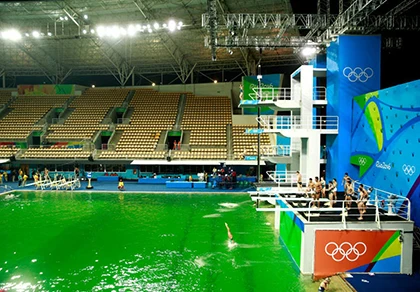 Tại hồ bơi dành cho môn nhảy cầu Olympic Rio bỗng dưng nước không phải là màu xanh da trời như thường thấy mà chuyển sang màu xanh lá cây một cách bí ẩn.