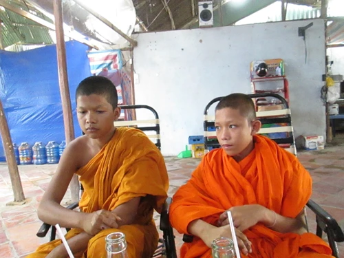 Sư Mai (phải) và sư Lộc tiếp xúc với PV chiều 24-3 tại một quán nước bên ngoài bệnh viện đa khoa Vĩnh Châu. Ảnh: N.NAM
