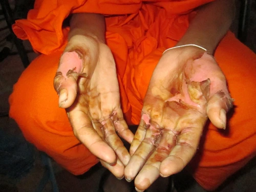 Hiện sư Lộc đã được xuất viện ngày 23-3. Sư Mai vẫn còn nằm viện điều trị. Theo quan sát của PV, bàn tay sư Lộc bị tróc da nhẹ hơn sư Mai. Các ngón tay sư Mai đang ăn da non, lớp da cũ đen đang rộp để hở lớp da non đỏ hồng, các ngón tay chưa thể duỗi thẳng.