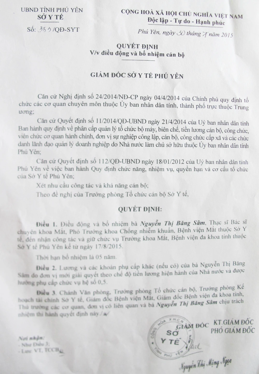 Ngày 30-7, giám đốc Sở Y tế tỉnh Phú Yên ban hành quyết định điều động, bổ nhiệm BS Nguyễn Thị Băng Sâm, Phó khoa Chống nhiễm khuẩn BV Mắt (thuộc Sở Y tế) đến nhận công tác, giữ chức vụ trưởng khoa Mắt BV Đa khoa tỉnh kể từ ngày 17-8. Tuy nhiên, ngày 13-8, BS Sâm gửi đơn đến Sở Y tế từ chối chức vụ được bổ nhiệm với lý do chưa đủ năng lực lãnh đạo. Ngày 19-8, Sở Y tế có công văn yêu cầu BS Sâm phải chấp hành nghiêm túc quyết định điều động, bổ nhiệm trên do khoa Mắt BV Đa khoa đang thiếu bác sĩ chuyên khoa mắt, vị trí trưởng khoa cần được bổ sung kịp thời để duy trì hoạt động của khoa. Công văn này cũng nêu rõ: Lãnh đạo Sở Y tế xét thấy ThS-BS Sâm là đảng viên, có trình độ chuyên môn, năng lực công tác đáp ứng được yêu cầu nhiệm vụ, vị trí mới.